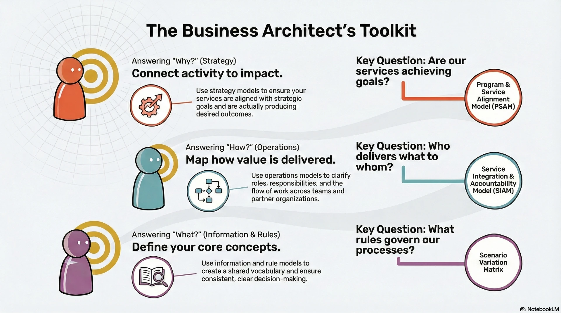 This chapter details the Business Architect's toolkit, outlining nine core models for strategy, operations, information, and rules. It provides guidance on selecting models, mapping them to the EBA Roadmap, and integrating them to ensure traceability from strategy to execution.