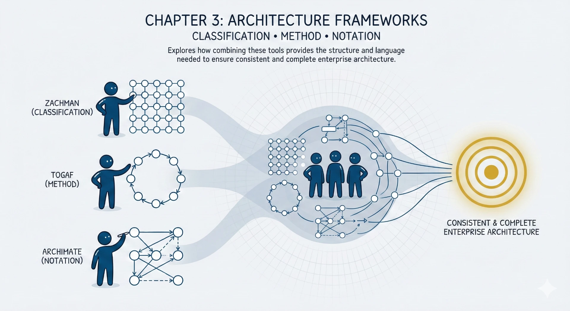 This chapter explores architecture frameworks, distinguishing between classification (Zachman), method (TOGAF), and notation (ArchiMate). It explains how combining these tools provides the structure and language needed to ensure consistent and complete enterprise architecture,.