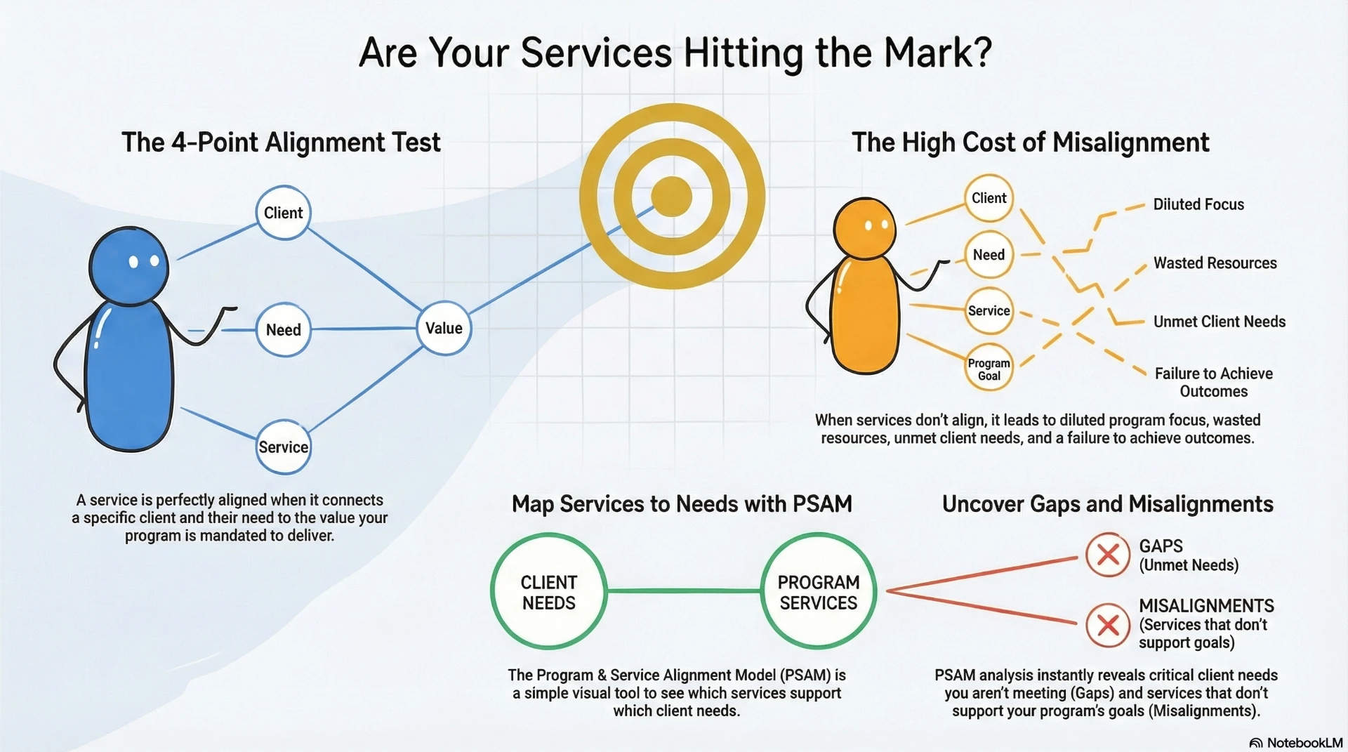 1. **Review a recent service addition or removal decision in your program. Was alignment with target group needs explicitly considered?** If you had built a PSAM before the decision, would it have changed the outcome?