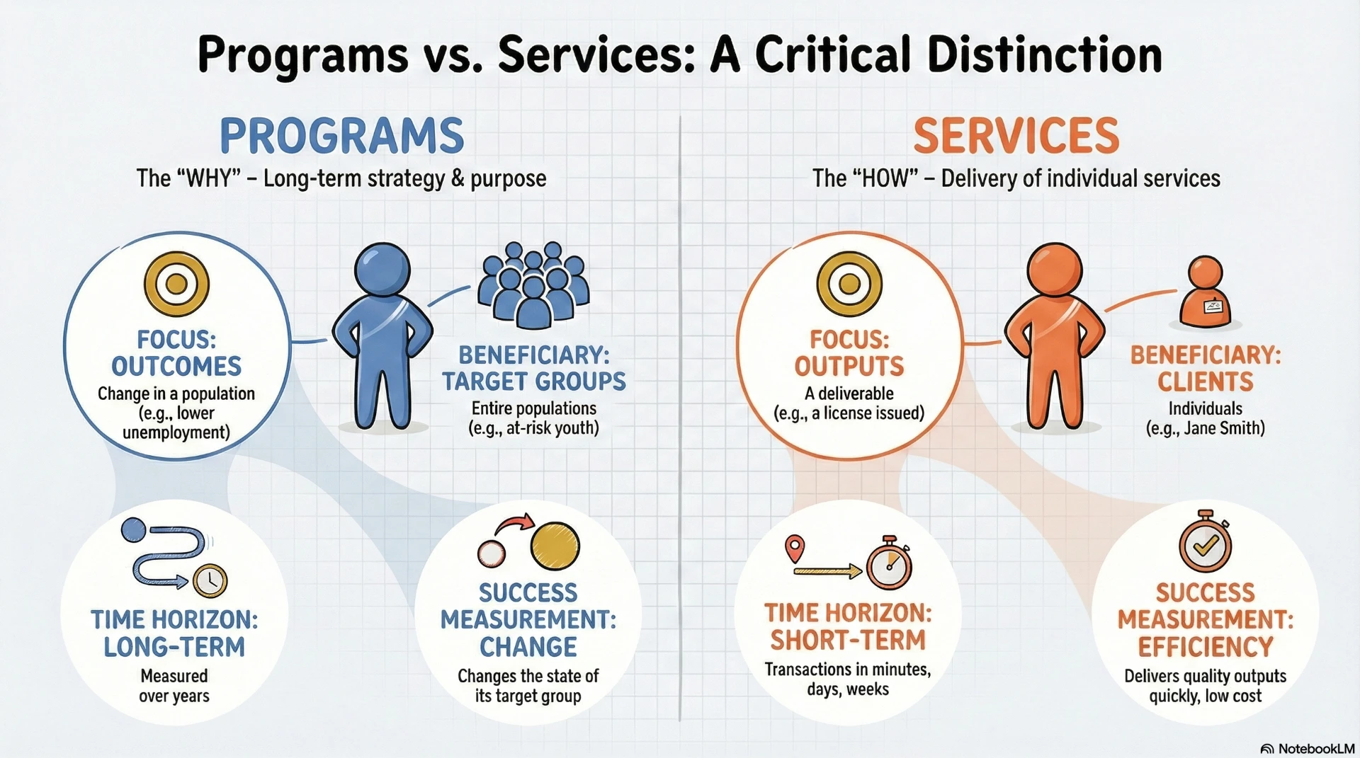 3. **The Alignment Question**: Can you trace clear connections between services your organization delivers and outcomes it's trying to achieve? If the connections are unclear, what's the consequence?