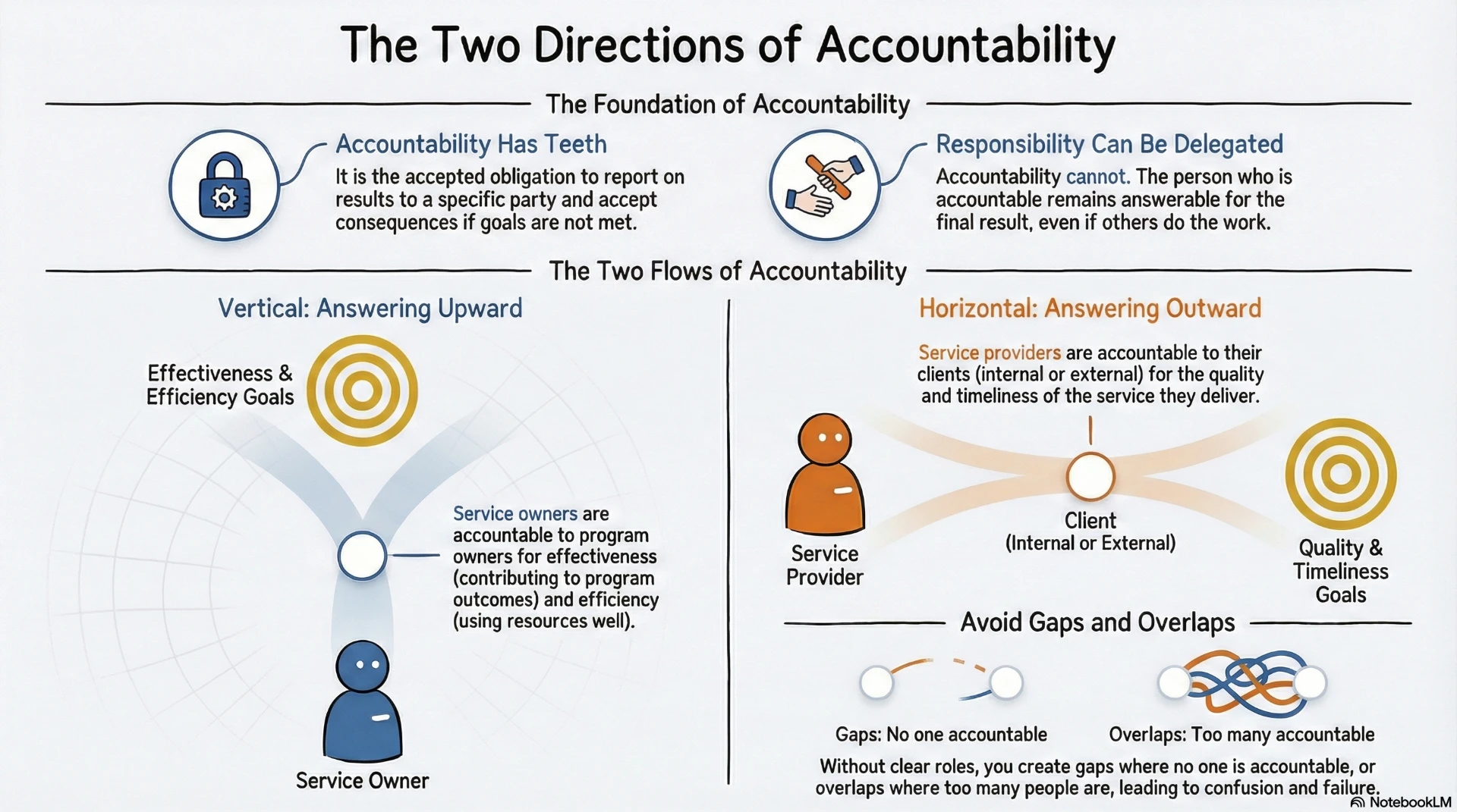 This chapter details how to design accountability frameworks by distinguishing vertical accountability for outcomes from horizontal accountability for service quality. It explains how to use matrices to map roles to results and eliminate governance gaps or overlaps.