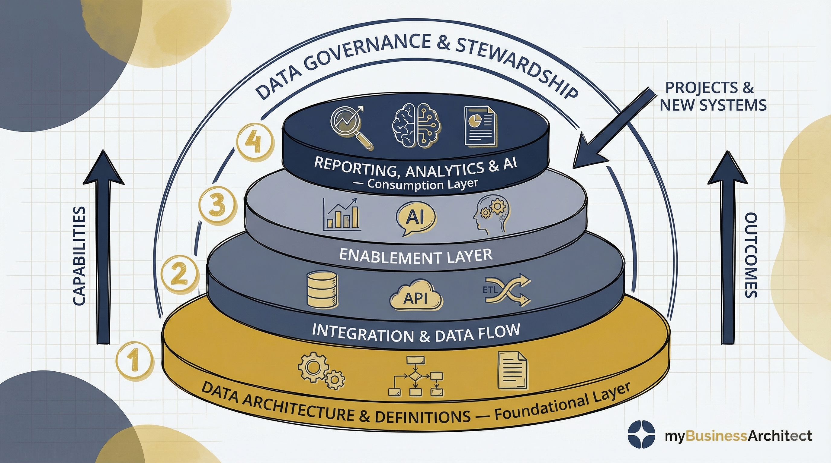 The two arrows in the diagram tell the same story from opposite directions. Building this architecture is a progressive capability development process: it starts with foundational capabilities (data architecture, metadata management, governance structures) and expands upward into integration management, analytics, and eventually AI. Each layer builds on the one below it. The sequence can't be shortcut. As those capabilities mature, the outcomes become visible: reduced duplication, faster access to trusted information, more reliable integrations, improved reporting quality, and the headroom to pursue future innovation. The outcomes don't appear at the moment of investment. They appear as the capability stack matures from the bottom up.